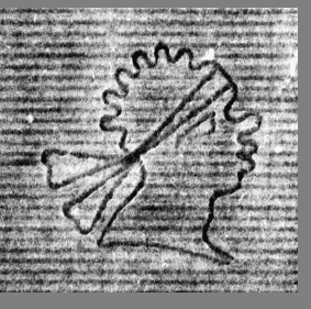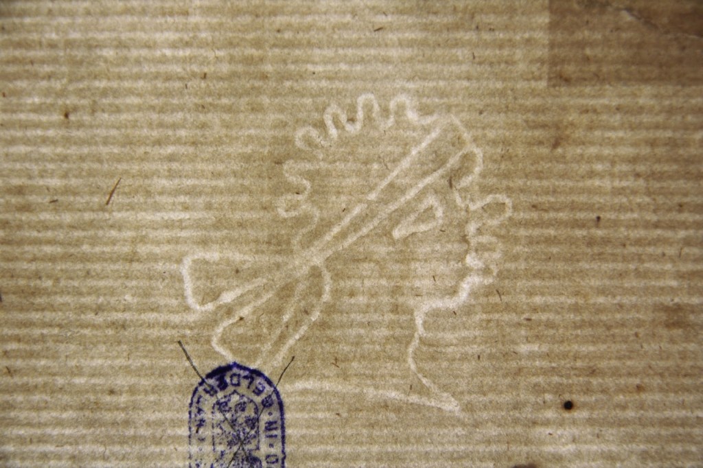 The watermark is immediately noticeable in the paper of 1-685. It is a beautiful side view of a Moor’s head (image 2). A watermark is an image ín (and not ón) the paper. This is made by attaching an figure of iron wire to the sieve used to scoop the paper (image 3). Because the image lies on the lines of the sieve, the paper becomes slightly thinner at this point. When the light shines through the paper, you see the image.