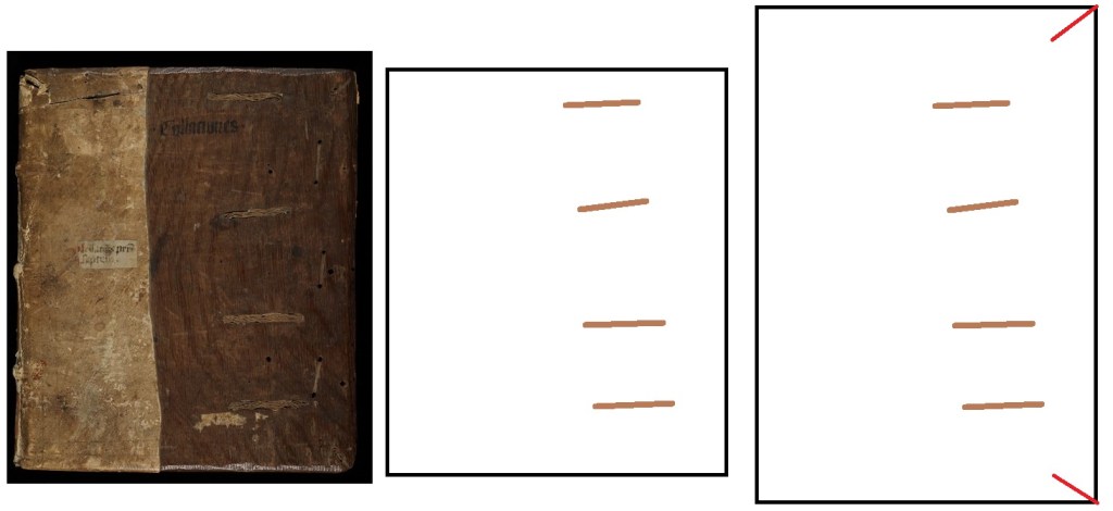 De volgende vraag is of dit plat ook onderdeel was van de eerste band van dít boek, of dat het bij een ander bronboek hoorde. Daarvoor kijken we naar de positie van alle bindingen en de naaigaten in het hart van de katernen. Het is niet moeilijk te zien aan de buitenkant dat er een kaarsrechte lijn te trekken is tussen de plek van de huidige gotische bindingen en de gaten van de karolingische aanrijging.