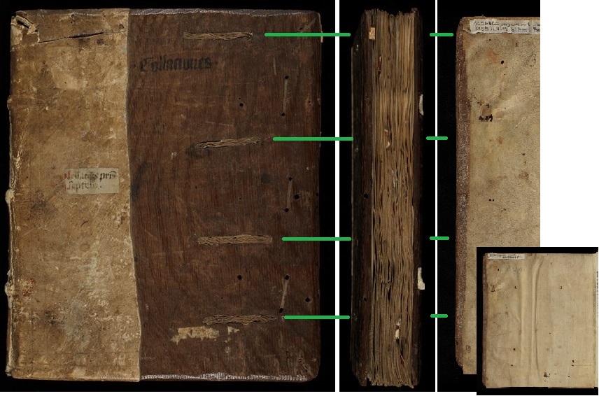 Een zeer mooi voorbeeld van hergebruikte houten platkernen is B V 14 uit de Universiteitsbibliotheek van Basel. Het bekledingsleer laat een deel van de platten vrij, waardoor er vrij zicht is op allerlei gaten en gleuven aan de rechter kant van het voorplat, gevuld met oud touw. Wat is hier aan de hand?