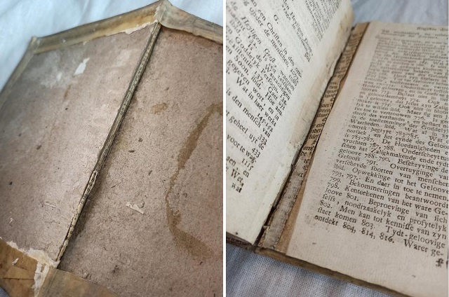 Binnenzijde voorplat met maculatuur in de kneep, en het midden van openslag op blz 1144-1145. P.065.1749