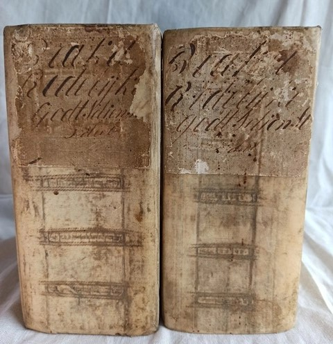 In mijn eigen collectie heb ik enkele perkamenten boekbanden waarvan de bekleding is hergebruikt; het komt van een ander boek vandaan. In dit blog wil ik een tweetal banden beter bekijken. De twee delen uit respectievelijk 1748 en 1749 bevatten de ‘Redelyke godtsdienst’ van Brakel. Twee zeer dikke boeken, gebonden in perkament. Hergebruikt perkament.