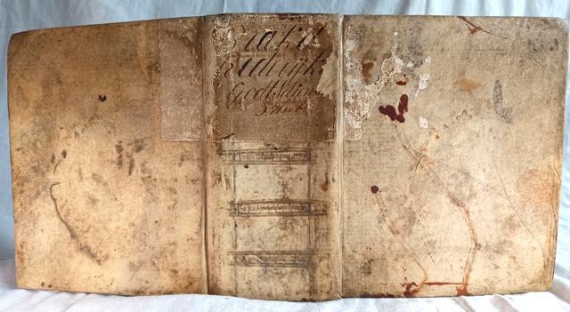 De band om het huidige doelboek is helaas niet origineel bij de inhoud, beide boeken zijn ergens in de negentiende eeuw herbonden (uitgaande van de schutbladen en het kapitaal). Dat betekent dat de stukken perkament van de bronboeken niet per sé van voor 1750 hoeven te zijn. We weten alleen dat ze bronboeken in de negentiende eeuw van hun band zijn ontdaan en dat het perkament vervolgens is hergebruikt.