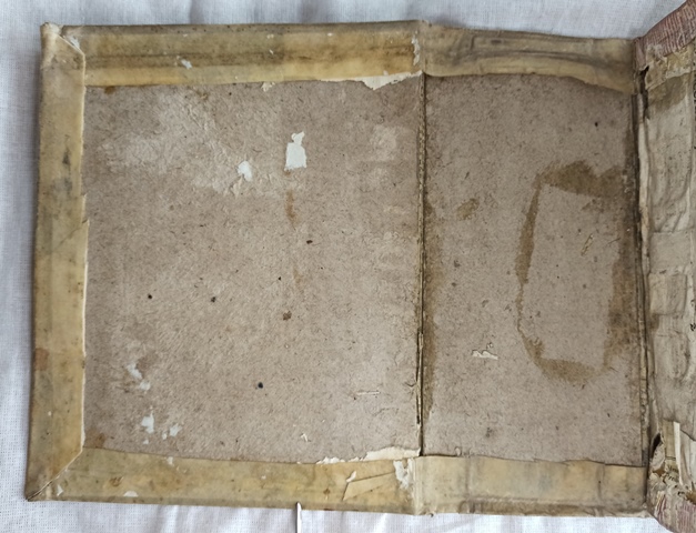 De binnenzijde van het voorplat en de rug laat ons een tweetal dingen zien van het bronboek. Op de inslagen aan de kop- en staartzijde van het voorplat zien we horizontale lijnen van de blindstempeling. Op de inslag links, langs de frontzijde, is ook een soort afdruk zichtbaar maar dit blijkt gewoon vuil te zijn.