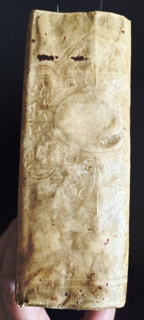 The 3 volumes below all have the blind tooled center stamp of the covers of the sourcebook on the spine. A clear sign of reuse. For the first and last, the piece of parchment was turned 90 degrees, for the middle binding the piece of parchment was reused in the same position.