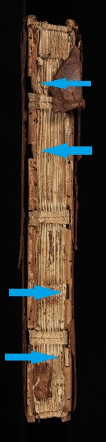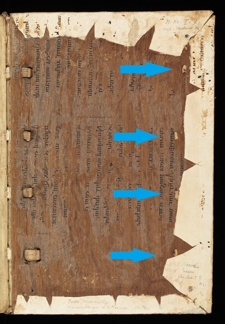 Wood was always firmly joined to the bookblock by threading the bands of rope or leather through the wood. For this purpose, various holes and slits were made in the wood. When a board is reused, new holes and slits are created for the targetbook, leaving residual holes from the sourcebook.