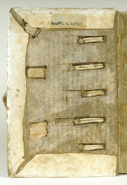Book fittings, such as bosses, corner and center pieces and closures, leave marks on the covering. Much of the fittings has disappeared from the books over the centuries, and the imprints are the only evidence that it was ever there. But sometimes the imprints are in places where they don’t belong. A sign of reuse.