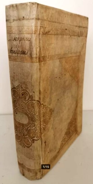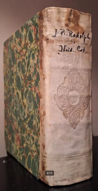 Het bandje hieronder komt uit mijn eigen collectie. Een stuk perkament (van een spitselband) is hergebruikt om de rug te bekleden. De titel van het bronboek is nog net zichtbaar linksboven op het voorplat. Het deel dat dus nu het voorplat bekleedt, was dus de rug van het bronboek. En het bronboek bevatte de Christianae Theologiae Systema Maius van Marcus Wendelin.
