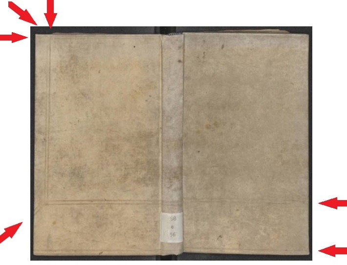 The 12th century binding below has five bosses on each board, as usual in a symmetrical pattern of, in this case, four on the corners and 1 in the middle. The back cover is missing one, the imprint is still clearly visible (green arrow). But there are many more imprints visible, with all the white arrows. These prints are absolutely not symmetrically distributed, although the 3 prints on the front cover do give the impression of being part of the same kind of quintet. But the other 2 of this quintet are not visible. Also, 2 prints ‘fall off’ from the binding, namely the top 2 on the back cover, of which 1 print continues on the front side and 1 print continues on the spine. These should be imprints of bosses on a slightly larger sourcebook. There is also a clear line visible between the 2 red dots, parallel to 2 of the prints. Is this the old sourcebooks shoulder ?