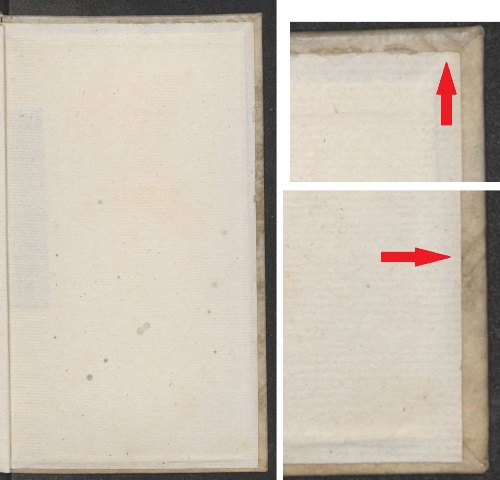 Om helemaal zeker te zijn kun je bij een band als deze naar de inslagen kijken. Hieronder de binnenzijde van het achterplat, met 2 uitvergrote details. Je ziet duidelijk de diagonale lijnen doorlopen op de inslag. De rechte lijnen zijn niet goed zichtbaar, deels doordat ze schuil gaan onder een andere inslag, deels vanwege het verlijmen, waardoor de vouwen minder scherp worden. Een blindstempelpatroon op de buitenzijde van de band loopt nooit door op de inslagen. De stempeling wordt pas aangebracht nadat de band is bekleed en het is schier onmogelijk om een stempeling netjes rondom een plat aan te brengen. Afdrukken die doorlopen wijzen dus ook op hergebruik.