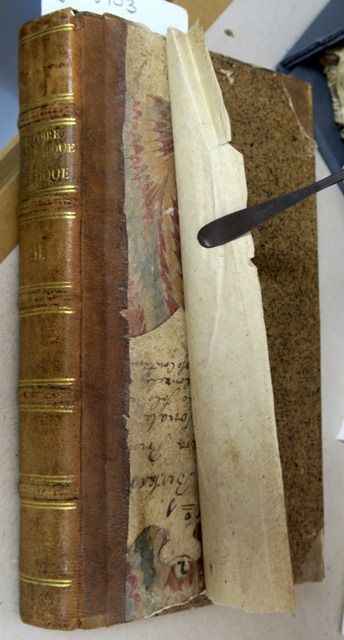 When reusing a piece of covering, a bookbinder also has to deal with the title of the sourcebook that may be on the covering. Not only can this be a very nice indication of reuse, it often shows what the sourcebook was.