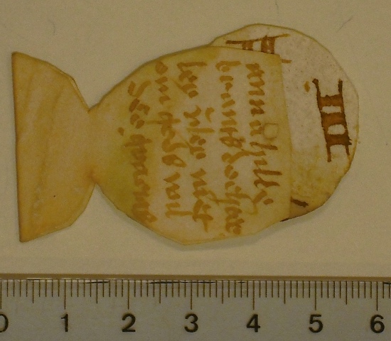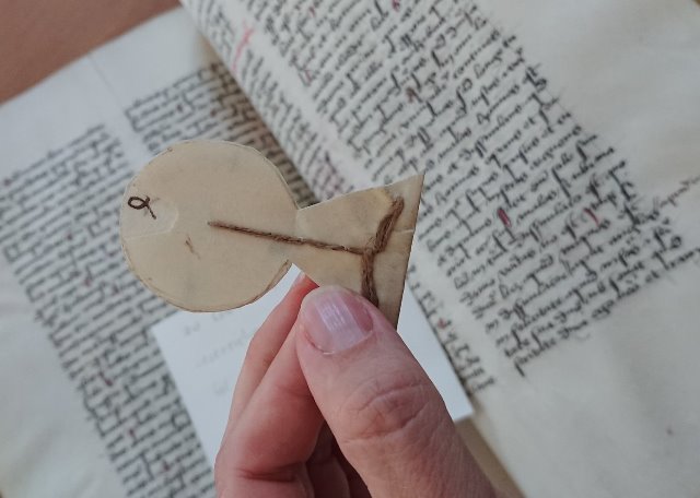 - Een houdertje dat is gemaakt van een dubbelgevouwen stuk perkament. Aan de ene kant zit het gevouwen om het leeslint waardoor het er niet af kan, aan de andere kant zit met touw het wieltje vast. Houdertjes heb je in alle soorten en maten, soms met wat versiering of tekst.